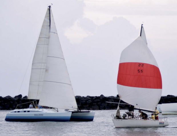 Shuttleworth designed catamaran w/ round bilges, plumb bows and dagger board in each hull. Flush decks and open cockpit aft; companionway with hatches steps down to cabin areas in each hull.